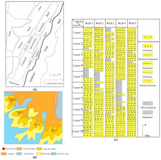 Structural backdrop (a), paleogeography (b), and lithology distribution in different wells (c).