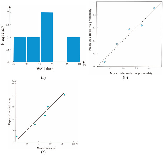 Frequency histogram, normal P–P plot, and normal Q–Q plot. (a) Frequency histogram of the sandstone proportion in the five wells. (b) P–P plot of the sandstone proportion in the five wells. (c) Q–Q plot of the sandstone proportion in the five wells.