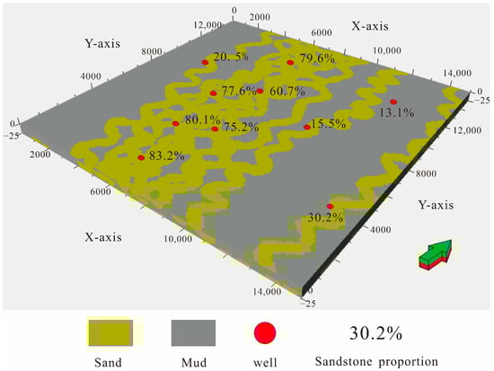 The closer the relationship between the sample mean and the population mean is in a normal distribution study, the more samples are used. However, this method is based on a t distribution and has low requirements for sample size, so it is also applicable for low samples, and there is no need to worry about the small number of samples without principle support. The underlying presumption, though, is that the raw data is as normally distributed as feasible, which can have a big impact on how satisfied people are with the outcomes. We also need to pay attention to data processing and optimization. In actuality, data distribution is frequently uneven, or even only for a partial data cluster distribution, which will impact the outcome of calculations. The clustering data will raise the weight of the related type because each individual data point has the same weight, which will cause the result to deviate. The distribution of wells is relatively sparse in the early phases of oil exploration and development, but as these phases advance, well density rises, and the impact of well dispersion must be taken into account. If the data distribution is too dense, the dense distribution characteristics of such data may have an impact on the estimation of the mean value. Before using the sample data, it is necessary to carry out the declustering step to eliminate the impact of the dense data on the result. Cell declustering and polygonal declustering are two declustering techniques, and the suitable declustering can be chosen based on various regional characteristics or the type of data. In particular, in the study of reservoir geology, it is crucial to underline that expert knowledge should be maintained in the process of data processing and optimization, where geological knowledge will determine whether or not a trend is retained. A simple fluvial reservoir illustrating the effects of data clustering is constructed using an object-based approach (Figure 4). The proportion of sandstone in the reservoir is set at 40%. The length and width are 15,000 m and the thickness is 25 m. The channel sand body in the reservoir is mainly located at the X-axis at 4000–10,000 m (Figure 4). Due to the influence of oil and gas collection, most drilling is located in the area with a high proportion of sandstone, because sandstone is a favorable place for oil and gas accumulation. By calculating the sandstone proportion of all the wells, the sandstone proportion of the reservoir is estimated to be 53.57%. Obviously, this is higher than the set fraction. The research area is divided into two parts: high proportion and low proportion, and the surface area represents the weight. The highest proportion is the position of the X-axis at 4000–10,000 m, the average is 76.07%, and the weight is about 0.4. The other positions are low-proportion parts, with an average of 19.83% and a weight of about 0.6. At this time, the proportion of sandstone is 42.32%. The latter is closer to the true value of 40%. Declustering is necessary at times.