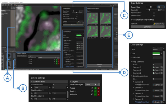 Figure 1. BGT screenshot in the Unity3D engine among its components: (A) Draw Area Panel: the green area corresponds to trees, the purple area to minerals, and the brown areas to animals; (B) General Settings Panel; (C) Draw Settings Panel: Brush size ranges from 1 to 52, intensity from 0 to 1; (D) General Settings Panel: BGT’s display options and layer settings; (E) Layer Settings Panel: Display Options Panel. - 2.