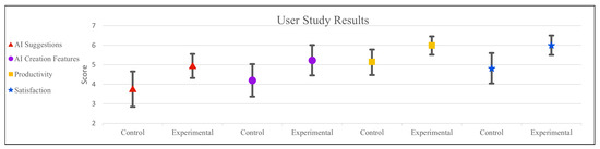 - Productivity: There was a significant difference in perceived productivity, between the experimental (M = 5.98, SD = 0.78) and control groups (M = 5.13, SD = 1.17); t(26) = −2.20, p = 0.037. This means that participants in the experimental group considered that the tool helped them to be more productive than the ones in the control group considered it helped them. It is important to note that both groups’ means were over four (which is the mid-point of the seven-point Likert scale). This could be related to the fact that participants were asked about the BGT in general and not only about the AI suggestions. In other words, both groups perceived better productivity, with the experimental group showing a greater effect.