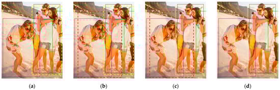 With the wide spread of convolutional neural networks, numerous object detectors [,,] have been proposed based on deep learning features, some of which have been applied to pedestrian detection after fine-tuning. Furthermore, several proposed pedestrian detectors [,,] have attempted to detect pedestrians using high-level semantic features [,] from another perspective. In order to obtain all the pedestrians in the images, most of the above-mentioned pedestrian detectors are dense detectors, which generate multiple proposals for each pedestrian. However, each pedestrian is represented by only one optimal proposal in the final predictions, for which NMS is widely used to remove duplicates. NMS was originally implemented via the greedy algorithm, which is known as Greedy NMS. For each pedestrian, it uses a rigid threshold in order to divide a uniform suppression interval, and directly discards all other proposals within the interval to remove the duplicates, which satisfied the need for pedestrian detection in sparse scenes in early studies. Recently, as artificial intelligence [] has gradually penetrated our lives, the demand for pedestrian detection in more crowded scenes, such as shopping malls, railway stations, airports, and streets, has increased. However, dense crowds and various shooting angles mean the pedestrians in the images are heavily occluded by each other, resulting in highly similar proposals between pedestrians and their surrounding occluded pedestrians, and leading Greedy NMS to mistakenly consider the proposals of occluded pedestrians as duplicate ones, and then, discard them. The above-mentioned problem finally means that the detectors fail to meet the demand for pedestrian detection in crowded scenes, as shown in Figure 1a.