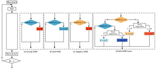 Comparison of the flows of different NMS algorithms. (a) The flow of Greedy NMS; (b) the flow of Soft NMS; (c) the flow of Adaptive NMS; and (d) the flow of MA-NMS, which is proposed in this paper.