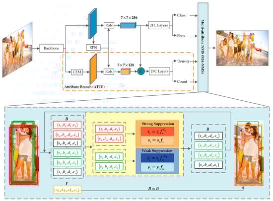 To address the above-mentioned problem, this paper proposes a Multi-Attribute NMS (MA-NMS), which enables adaptive suppression based on the density and count attributes of pedestrians. Additionally, an attribute branch (ATTB) is proposed to obtain the density and count attributes, which guides the adjustment of suppression intervals and intensity in MA-NMS. Furthermore, leveraging the proposed ATTB, a specialized detector based on MA-NMS is constructed for pedestrian detection in crowded scenes, which incorporates the density and count attributes of pedestrians and adjusts the NMS algorithm to enhance the accuracy of pedestrian detection in crowded scenes.