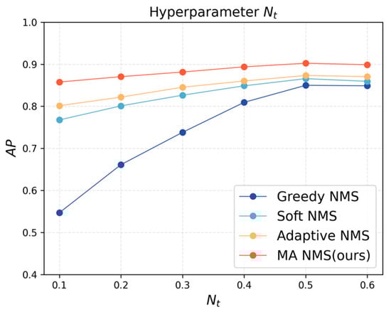 Our MA-NMS, along with well-known NMS algorithms, such as Greedy NMS, Soft NMS [], and Adaptive NMS [], incorporates the hyperparameter as the rigid threshold. In order to achieve their optimal performances and sensitivities, different values of are employed in the experiments. The evaluation metric is used to measure the average precision of the pedestrian detector. To ensure a fair comparison, all the NMS algorithms are implemented using the same programming language and separately applied to the baseline with the same settings. Figure 4 illustrates the results of NMS algorithms with varying values of . Obviously, MA-NMS achieves the best performance across all values of , and the optimal results for all the NMS algorithms in the experiments are obtained, when is set to 0.5. Furthermore, the results shows that Greedy NMS remains consistent between 0.55 and 0.85, Adaptive NMS is stable between 0.80 and 0.87, while MA-NMS remains stable between 0.85 and 0.90, with only 16.67% and 71.42% of their values floating, which indicates that MA-NMS exhibits lower sensitivity to the hyperparameters compared to these well-known NMS algorithms.
