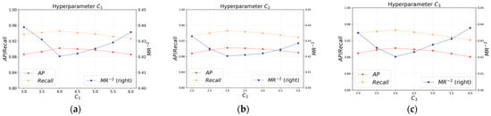 Results of MA-NMS with varying values of exponential constants. (a) Hyperparameter ; (b) hyperparameter ; (c) hyperparameter . The higher the and , the lower the , and the better the result.