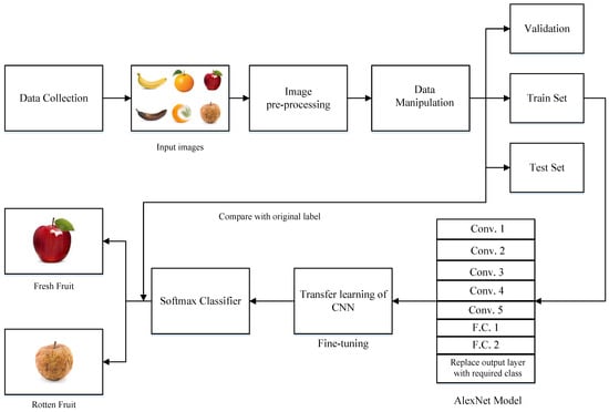 Recently, several machine learning-based methods for fruit freshness classification have appeared in the literature [3]. Few of them use CNNs, Deep CNNs, and Faster-RCNN to accomplish the fruits classification task [4]. The CNN models are also implemented in a number of tasks, for instance, object detection, classification, and recognition [3]. Over the past few years, various CNN architectures have been developed, and they have demonstrated excellent performance for image classification. Transfer learning is one of the techniques that uses previously developed architectures on various problems to produce more accurate results. Deep learning and machine learning techniques integrated with transfer learning could also be used for image classification. This study investigates the possibility of transfer learning with regard to CNN models for the quality assessment of fruits instead of using CNN architectures from starch. In real-life, classification of fruits is normally carried out by people that we believe is ineffective for fruit farmers and fruit sellers. Therefore, the development of an accurate classification method is desired, which will significantly reduce human efforts and costs. A robust fruit freshness classification method will also reduce the industry’s production time in the agriculture domain by correctly identifying fruit defects. Therefore, this study proposes a novel and automatic fruit freshness classification method using fine tuning and transfer learning of the AlexNet. The effectiveness of the proposed method is validated on three publicly available fruit datasets. Our main contributions to this manuscript are listed below.