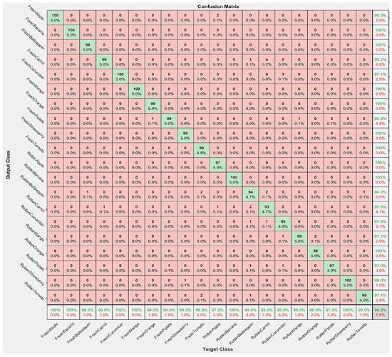 In this section, we discuss in detail the performance of our developed method through confusion matrixes for each of the datasets described earlier. For Dataset 1, Figure 6 shows our developed classifier’s performance through a confusion matrix. The diagonal in the confusion matrix indicates true positives or actual values and shows the classification accuracy, which is achieved by our developed method. As discussed earlier that Dataset 1 contains 20 classes in which each of the fresh and rotten classes contains 10 items, respectively. For each of the fresh categories of apple, banana, and mango, 100% classification accuracy is obtained. Whereas for the fresh categories of orange and strawberry, our proposed method yields 99% accuracy.