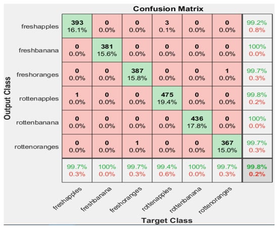 Figure 7 shows the classification accuracy obtained by our developed method on Dataset 2. Since this dataset contains total of three fruits with six classes. As shown in the diagonal of Figure 7 that for each of the fresh apple, banana, and orange our developed method obtains 99.2%, 100%, and 99.7% accuracy, respectively. Similarly, for the rotten categories of these fruits, our proposed algorithm obtains 99.8%, 100%, and 99.7% classification accuracy for apple, banana, and orange, respectively. We believe that these findings are useful and encouraging. In the future, many food industries might also benefit from our findings.
