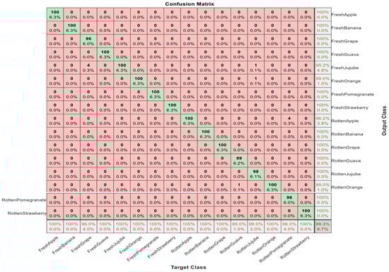 In our series of experiments, Figure 8 reports our experiments on Dataset 3, which was briefly described earlier. This is a huge dataset and contains several classes. As can be seen in Figure 8, for fresh categories of apple, banana, guava, jujube, orange, pomegranate, and strawberry, our developed method yields 100% classification accuracy. Moreover, for fresh category of grape, our developed algorithm yields 96% classification accuracy. Similarly, for the rotten categories of the aforementioned fruits, 100% classification accuracy is obtained for apple, banana, grape, orange, and strawberry. We are optimistic that our findings are encouraging and useful.