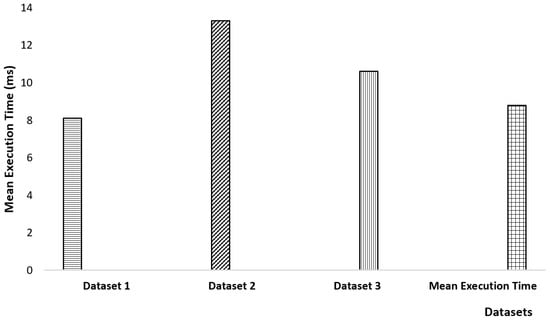 In Figure 9, we show the computational complexity of our developed method. We work in three different databases in fresh and rotten fruit datasets. Training took almost 67 h on all three datasets. For Dataset 1, training took 31 h on 32,667 images and tests images are 1000. While for Dataset 2, almost 17 h were consumed on 10,901 images and tests images are 2445. Finally, for Dataset 3, our method consumed 19 h with 12,335 images and tests images are 1600. As shown in Figure 9 in Dataset 1, test image consumes almost 8 ms to yield the final classification output. Similarly, for Dataset 2, slightly over 13 ms are consumed to obtain the final output. Our method requires almost 10 ms to yield the final classification result on Dataset 3. As shown in the last tower in Figure 9, on the average, our method requires almost 8.8 ms to yield the final classification result.