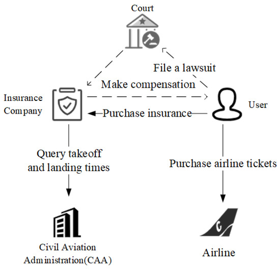 The insurance industry faces trust problems, and the emergence of blockchain and SC technology provides a solution to this. The process of purchasing flight delay insurance and obtaining compensation is illustrated in Figure 1. In a real-life scenario, users may purchase airline tickets from airlines and potentially purchase flight delay insurance from insurance companies. The Civil Aviation Authority (CAA) is responsible for formulating flight departure plans and recording the actual takeoff and landing times of flights. If users encounter flight delays or cancellations after purchasing flight delay insurance, they can file a claim with the insurance company. Users need to provide relevant supporting documents, such as tickets, flight delay notifications, and actual departure and landing times. The insurance company will assess the legitimacy of the claim based on the terms of the contract and the claim requirements. The claim will undergo a manual review, and, if it meets the criteria, the insurance company will provide compensation. During this process, the insurance company’s review time may be lengthy, and there is a possibility that they will deceive the user. If the insurance company denies the claim, the user may need to file a lawsuit against the insurance company in court, to ensure that their rights are protected. This process can be time-consuming and requires a significant amount of effort.