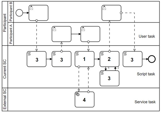 - SwimlaneWe design three types of swimlanes, i.e., Participant, Current SC, and External SC. As shown in Figure 2, at the top of the swimlane is the behavior of the Participant. User tasks are modeled in the Participant swimlane; because this type of task is run in an external system, it will not be resolved. Service tasks are modeled in the external SC swimlane, which represents the external SC behavior that the current SC needs to call. The middle part is the current SC swimlane, which is the core of the BPMN model, storing all script tasks of the current SC.
