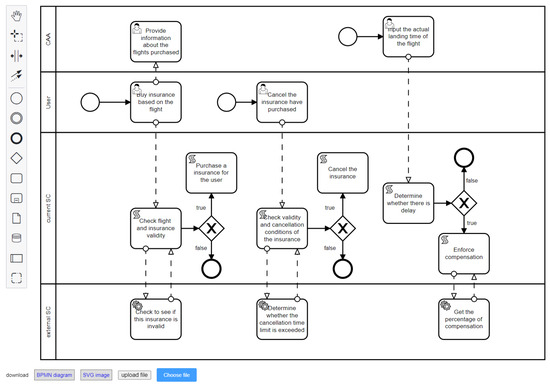 BPMN models devise business process diagrams to describe operations in a business. BPMN models can be encoded and parsed, so we can obtain various types of information about multi-party interaction scenarios, such as rules, execution processes, participants, etc. However, the BPMN model only considers the process behavior of the system, without considering the implementation mode, and, in practical applications, the system may be subject to external disturbances, so it cannot guarantee that all stakeholders trust the process. A lack of trust will hinder the collaborative process and affect its success [9]. Therefore, combining BPMN with blockchain is a suitable approach.