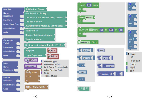This component uses Blockly Developer Tools (https://developers.google.com/blockly/guides/create-custom-blocks/blockly-developer-tools, accessed on 1 January 2023) to customize partial blocks of code, as shown in Figure 8a, while integrating the original syntax structure of Blockly, as shown in Figure 8b, so that the generated functions support the Solidity syntax rules.