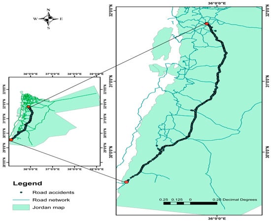 Highway 15 in Jordan (also known as the Desert Highway connecting Aqaba to Amman, 420 km) is a South–North link that receives 1,825,000 million vehicles per year. The desert highway recorded 107 fatal accidents in 2019 [5]. The alarming increase in road accident deaths and injuries in recent years has led to the identification of road accident hotspots. Therefore, accident route identification is a critical step toward total road safety improvement. This can be achieved via hazard metric assessment for accident hotspots, marking them for further investigation and improvement [6].