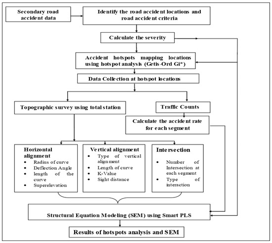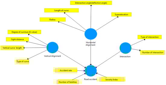 Although previous studies highlighted the effects of geometric design and intersections on road safety, they focused on some geometric parameters; for example, the radius of horizontal alignment [34,35]. Few studies have explained the factors which influence accident occurrence at road hotspots [36]. The studies also focused on the regression model and did not use SEM to explain the relationship. Furthermore, studies have explained the methods of improving vertical alignment to increase road safety, but have not investigated the extent of their impact on road safety [37,38].