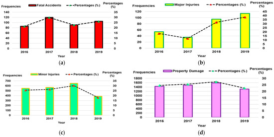Road accidents from 2016 to 2019: (a) Fatal accidents, (b) Major injuries, (c) Minor injuries, (d) Property damage.