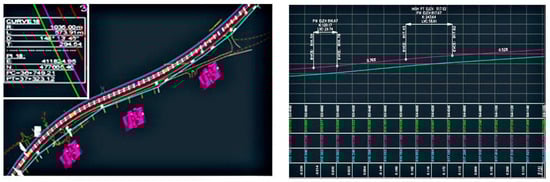 The collection of road geometric data includes horizontal and vertical alignments and intersections, and began with a topographic survey that was conducted using Total Station equipment. The survey was conducted at locations that were hotspots where horizontal alignments, vertical alignments, and intersections could be obtained. The 3D features for horizontal and vertical alignments include latitude, longitude, and elevation points. The data were exported to Civil 3D, from which it was extracted. The horizontal and vertical alignment elements in Figure 4 depict a section of the Jordan Desert Highway after exporting the road data to Civil 3D. The characteristics of each hotspot location’s horizontal alignment elements, including the intersection angle, the radius of the curve, superelevation, and the length of the curve, were used for future analysis. In addition, elements of vertical alignments, such as the length of the curve, K-value, sight distance, and the type curve, were used for analysis in the future.