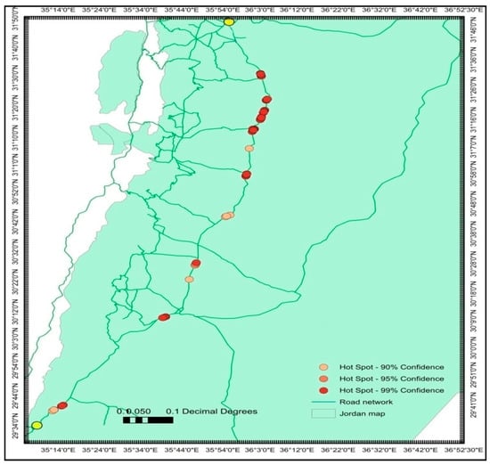 The spatial map of road accident hotspots along the Jordan Desert Highway.