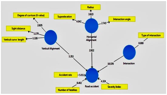 Thirteen indicators from the evaluation were assessed for their factorability and extracted as latent variables. Next, the researchers applied Exploratory Factor Analysis (EFA). Horizontal alignment, vertical alignment, and intersections were the categories into which the latent variables were classified. Ten screened indicators were repeated as indicators for these three latent variables. All latent variables were evaluated for validity and reliability by assessing the measurement model for the model. Regarding road accidents, there exist three indicators, namely accident rate, fatalities, and severity index. The structural model evaluation was then applied to the model. Table 1 displays the constructed model’s definitions. Four measurement models with four latent variables are incorporated into the proposed model. Each latent variable contains multiple indicators. Nevertheless, the measurement model for the latent variable road accidents contains a formative construct for the indicators. The other measurement model, meanwhile, is based on a reflective construct. The Goodness of Fit of the Model (GoF) criteria were also used for determining whether values of GoF were no fit (less than 0.1), small (0.1–0.25), medium, (0.25–0.36) or large (more than 0.36) enough to be considered as a globally valid PLS model [81]. Figure 5 depicts the concept model of SEM-PLS analysis for this study.