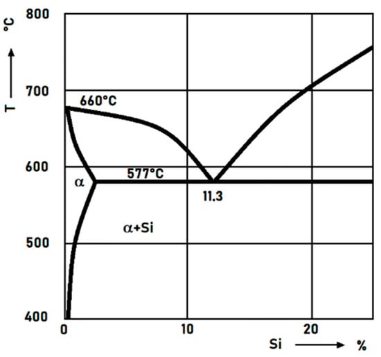 Al-Si-based alloys are commonly classified based on their silicon content. The eutectic composition of the Al-Si binary system is about 11.3% Si, and alloys with Si content below or above this value are referred to as sub-eutectic or supra-eutectic, respectively. The silicon content affects the properties of the alloy, such as its mechanical strength, ductility, and machinability [30,31].