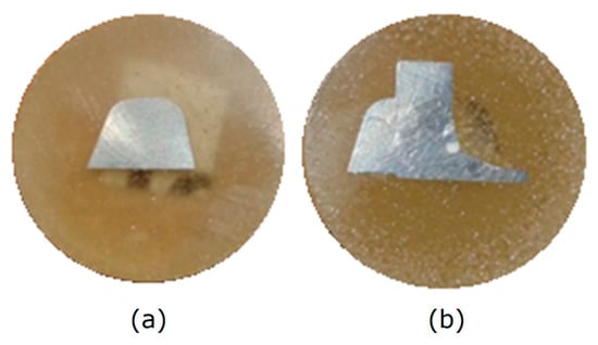 The use of a circular saw with water cooling (MIKRON manufacturer, Bratislava, Slovakia) and carefully selected technological parameters for cutting the casting were important for obtaining high-quality specimens for further testing. The low compressive force of the cutting wheel and high rotations per minute (3000) ensured a clean and precise cut without causing any damage to the specimens. Additionally, the use of dent acryl resin for casting the specimens ensured their stability and consistency during testing (Figure 3).