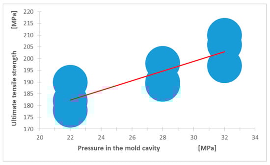 Dependence of ultimate tensile strength on the change of pressure in the mold cavity.