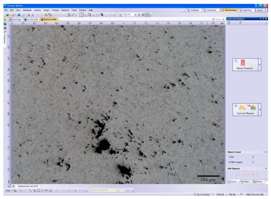 The porosity of casting was evaluated using an optical microscope, and the resulting images were analyzed using Stream Motion software (Figure 6). The software uses graphic filters with defined sensitivity to detect and evaluate pores in the images. Before measurement, the filters are set to an appropriate sensitivity level to ensure that only pores are detected. The objects in the images that meet all required conditions and differ in color from their environment are analyzed, and the program saves the results of all specimen values in tables, which are then used to generate graphical representations of the data.