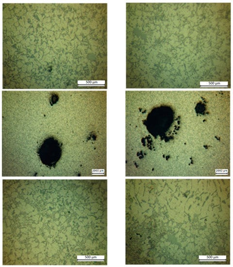 Figure 7 displays photographs that were used for the casting porosity analysis, and, for each specimen, three independent spots were selected to measure and evaluate porosity. It was necessary to select spots that were perfectly polished to avoid any scratches, dents, or cracks in the specimens that could be mistakenly evaluated as pores by the software. If such imperfections were included in the analysis, the porosity measurement results would be misrepresented, and the software could potentially overestimate the occurrence of porosity. Therefore, it was important to ensure that the selected spots were free of any such imperfections to obtain accurate measurements of the porosity of the casting.