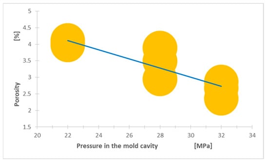The influence of technological parameters, such as pressure or holding pressure, on the final mechanical properties of castings and the inner structure is consistent with the findings of other researchers in the field of die casting [13,14,32]. This indicates a common understanding and agreement on the impact of these parameters on the quality of castings. Increasing the holding pressure consistently leads to a decrease in the percentage share of porosity in castings. This correlation highlights the importance of pressure control in minimizing porosity and improving the overall quality of the castings.