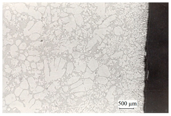 The formation of a band of fine structure is related to the degree of undercooling at the face of the mold, which in turn depends on the temperature of the mold, the location of the notch, and the method of filling the mold. Assuming the same temperature of the mold, when the melt flow hits the cold wall of the mold, which has a lower temperature than the melt, crystallization occurs with a very high degree of undercooling and a precisely defined direction of heat removal. This creates a band of fine crystals with preferential orientation in the direction opposite to the direction of heat removal. However, further crystallization takes place when thermal and pressure conditions are changed, which leads to a violation of the directionality of solidification. In this case, the filling mode of the mold may prevail over the heat removal rate, leading to a variation in the structure of the test rods.