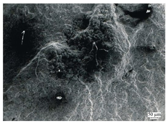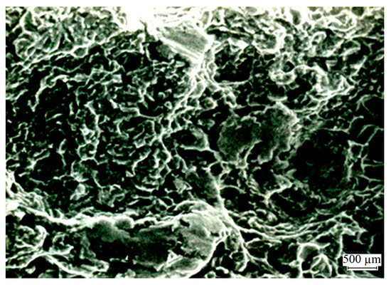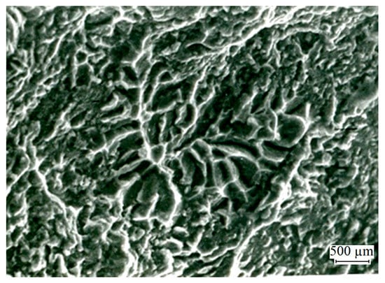 The microscopic analysis of the fracture surfaces of the analyzed samples revealed that the nature of the failure was the same for all samples. As shown in Figure 13, a typical violation of the alpha phase dendrites and eutectic was observed. In addition, several foundry defects were observed on the fracture surfaces: