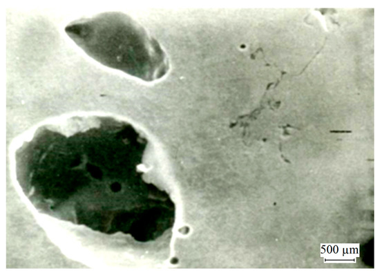 It is not uncommon for gas to be trapped in the mold during the casting process, leading to the formation of bubbles or voids in the final product. These voids can weaken the structural integrity of the casting and lead to failure under stress. The voids or bubbles observed in the analyzed samples were caused by the trapping of gases and air in the mold during the casting process. These voids are classified as type 1 errors and are likely due to the turbulent flow of the melt during casting (Figure 14). Given the wall thickness of the castings, their fine-grained structure near the mold face, and the applied pressure, it is unlikely that hydrogen exclusion was the cause of these voids.