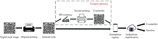 The production and forgery process of an anti-counterfeiting 2D code is shown in Figure 2. The authentic anti-counterfeiting 2D code is generated by the official generation system and printed by the printing device, and it is pasted on the commodity or document as an anti-counterfeiting label for circulation. The forger cannot obtain the original generated anti-counterfeiting 2D code digital file, so the forgery process involves scanning the digital image based on the authentic anti-counterfeiting 2D code, printing it again to obtain the forgery, and pasting it on the counterfeit goods or documents.