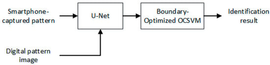The deep single classifier is composed of two modules: a feature extraction module based on U-Net and a one-class classification module based on boundary-optimized OCSVM. The feature extraction module is used to extract and generate the feature vector of the smartphone-captured pattern images for the training, boundary optimization and testing of the second classification module. The overall process is shown in Figure 3.