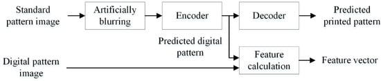 The auto-encoder training process is shown in Figure 4. The digital pattern generated by the anti-counterfeiting code generation system is input into the auto-encoder based on U-Net in pairs with the anti-counterfeiting code collected by the industrial camera and then artificially blurred. The encoder predicts the digital pattern from the input blurred pattern , and it takes the mean square error of the predicted pattern and the input real digital pattern as the loss item . The decoder predicts the predicted digital pattern again to obtain the possible print-captured pattern . Similarly, the mean square error of and is taken as the loss item . The loss function of the whole auto-encoder is composed of two loss terms, and the expression is as follows
