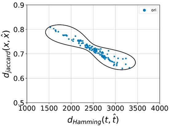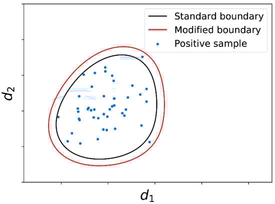The training set of positive samples, the boundary generated by OCSVM and the modified boundary is shown in Figure 5, where and are similarity metrics of the samples.