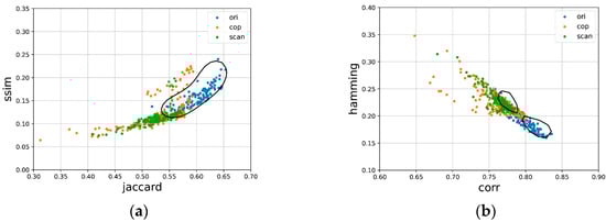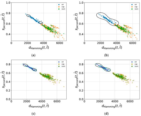 The sample scatterplot obtained by feature extraction in the first stage and the decision boundary obtained in the second stage corresponding to each classifier are shown in Figure 11a–d, where the label ori corresponds to positive samples (genuine patterns), while cop and scan correspond to duplicating and scan–reprinting negative samples (counterfeit patterns), respectively.