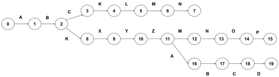 Figure 5 shows the generated AC automaton. It uses the “ABCKLMN”, “ABKXYZMNOP”, and “ABKXYZABCD” sample patterns, and failure transitions have not yet been added to automation. Each transition between states on the automaton results in single-character processing, and a state represents a single-character transition. Therefore, the number of states created for a single pattern is the same as the character length of the pattern. The automaton contains 19 states in total. Even if no failure transitions exist, the state transition table storing 19 transitions requires 19 memory entries.