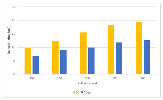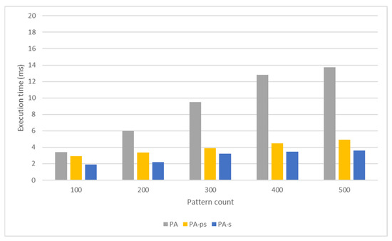 The pattern set used in the analysis of the study numbered [7] is obtained from the SNORT rules, and the DPI-matching process is executed using a dataset containing 20 patterns in the shared memory of the GPU. In addition, the K20 GPU hardware served in the pattern-matching process. Matching tests with the PA are performed on a pattern set containing 20 items obtained from the SNORT rules to create a similar experimental environment. The PA-s version of the PA is employed in the tests, which handled the DPI-matching process in the shared memory of the GPU.