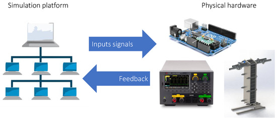 HIL systems consist of two main components: a real-time simulation platform and physical hardware that represents the system being assessed. The simulation platform generates inputs to the physical hardware and reads the outputs from it. The physical hardware responds to the inputs from the simulation platform and provides outputs that are fed back to the simulation platform (Figure 1). This closed-loop system allows testing the performance of the system being designed under various scenarios, including extreme and rare conditions that may be difficult or impossible to replicate in a real-world environment [2,4].