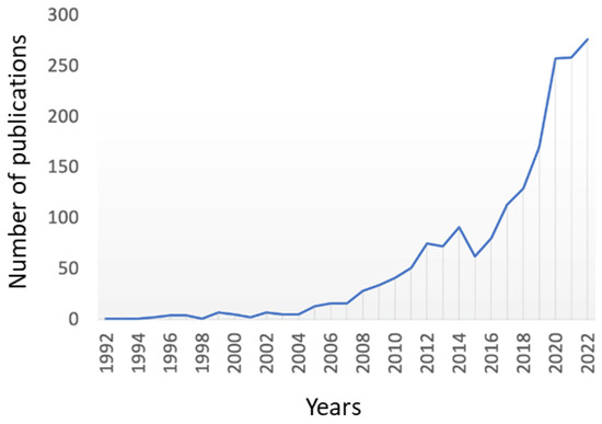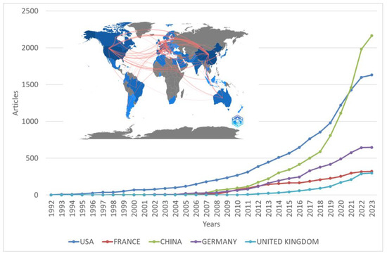 Figure 7 shows that the first documents appeared in the USA and, from 1992 until 2004, grew steadily in number of publications. France started to publish on the topic of study in 1998, and its growth has been steady since then, reaching 315 documents in 2022. Germany appeared in the figure in 2002, and while the growth was not explosive, it has been higher than in other countries, reaching 643 documents in 2022. The UK is the latest country that started to publish on the topic, having started in 2011, but in 2022, it reached 288 documents, nearly the same as France. Finally, China started to publish on the topic in 1999, but the number of publications per year has been increasing at a very high rate, with 501 documents already in 2017 and with 1982 documents in 2022.