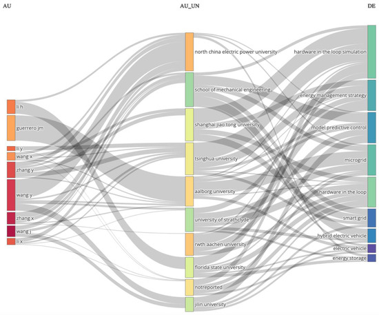 Three-field plot using R-studio software and bibliometrix library, relating the 9 authors and the 10 institutions with more publications with the 9 keywords appearing in more documents. Data obtained from Scopus in April 2023. Query: (TITLE-ABS-KEY(((“hardware in the loop” AND (energy)) ANDNOT “synthetic aperture”))).