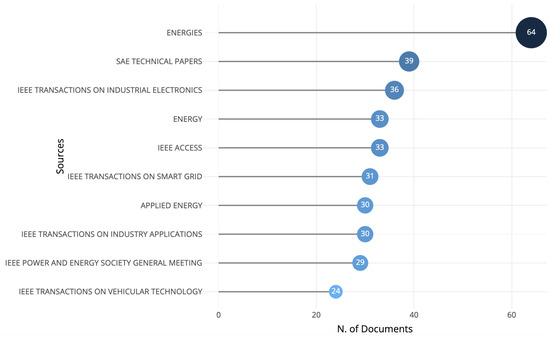 The sources most used to publish documents on HIL in energy systems (Figure 4) were Energies (with 64 documents), nearly doubling the rest of the sources, which were SAE Technical Papers (with 39 documents), IEEE Transactions on Industrial Electronics (with 39 documents), and Energy and IEEE Access (with 33 documents each). Of these ten sources, six of them are from IEEE (Institute of Electrical and Electronics Engineers), and two are from Elsevier.