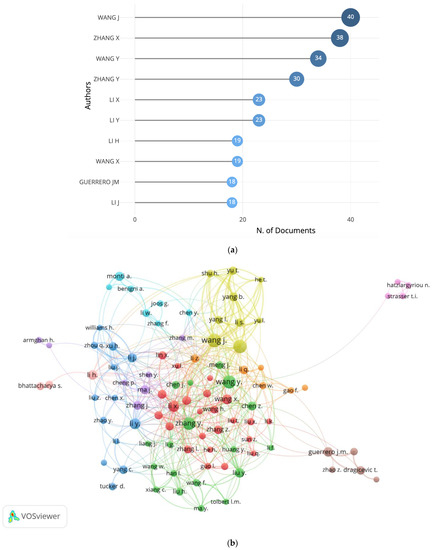 Figure 5a lists the authors with more documents retrieved with the query HIL in energy systems. The most prolific author had 40 documents, J. Wang (Jilin University), followed by X. Zhang (China Electric Power Research Institute—CEPRI, State Key Laboratory of Control and Operation of Renewable Energy and Storage Systems) with 38 documents, Y. Wang (Hebei University of Technology and China Automotive Technology and Research Center) with 34 documents, and Y. Zhang (Research and Development Center) with 30 documents. It should be highlighted that nine out of the ten authors for more documents are from China; the other author, J.M. Guerrero, is affiliated with the Center for Research on Microgrids (CROM) at Aalborg University in Denmark.