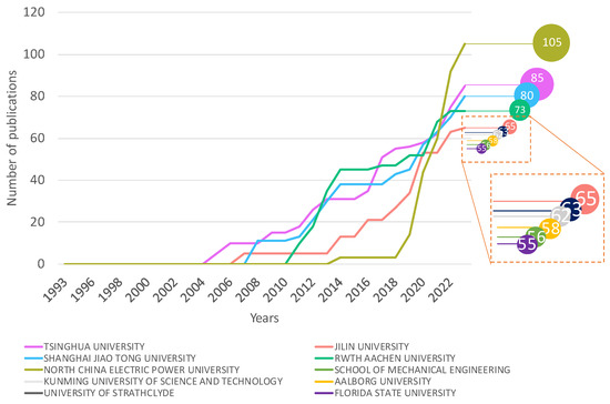 Figure 6 shows that the institution with the highest number of documents is North China Electric Power University from China (with 105 documents). Then, a group of three institutions appears, Tsinghua University and Shanghai Jiao Tong University, both from China, and RWTH Aachen University from Germany (with 85, 80, and 73 documents, respectively). The fifth institution with the most publications on the topic studied is Jilin University, China (with 65 papers). The next five institutions with a higher number of documents on the topic studied (graph inside Figure 6) are the School of Mechanical Engineering, Beijing Institute of Technology, China (with 63 documents), Kunming University of Science and Technology, China (with 62 documents), Aalborg University, Denmark (with 58 documents), University of Strathclyde, UK (with 56 documents), and Florida State University (with 55 documents).