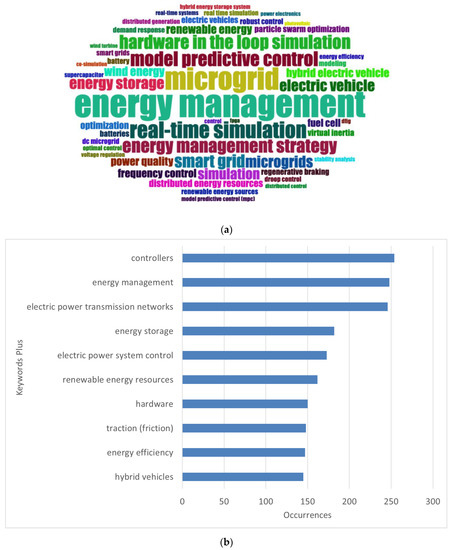 An interesting figure is Figure 9a, where the keywords more used are presented in frequency over time. Among the most recurrent keywords, the first one is “hybrid electric vehicles”, which appeared in 2006 and disappeared in 2016, with a maximum in 2010 and a term frequency of 6. “Energy conversion” appeared in 2010 but disappeared in 2012, being the keyword with the shortest duration but with the earliest appearance. Among the terms with more frequency, “hardware in the loop simulation” is the earliest one, lasting from 2012 to 2020, with a maximum in 2016 and a term frequency of 168. “Microgrid” and “energy management strategy” had their maximum frequency in 2020 and a term frequency of 131 and 126, respectively, starting only in 2018. Finally, the newest keywords are “cybersecurity” and “voltage control.