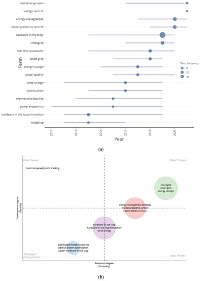(a) Trending topics and (b) thematic map of HIL in energy systems using R-studio software and bibliometrix library. Data obtained from Scopus in April 2023. Query: (TITLE-ABS-KEY(((“hardware in the loop” AND (energy)) ANDNOT “synthetic aperture”))).