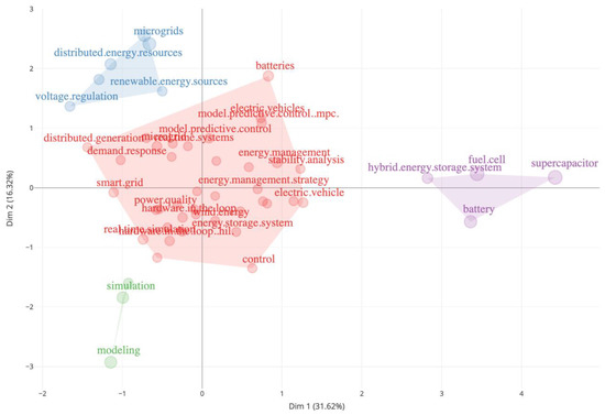 A factorial analysis of the keywords helps in understanding the main topics found in the research (Figure 10). There is a big cluster (red cluster) that includes most keywords related to the power system. For example, the terms “wind energy”, “power quality”, “smart grid”, and “distributed generation” are included here, but also terms related to control, such as “control” and “model predictive control”, and terms related to energy management and energy storage, such as “energy management strategy”, “demand response”, “electric vehicle”, and “energy storage system”, can be found. A second cluster (blue cluster) includes the keywords related to renewable energies, such as “renewable energy sources”, “distributed energy resources”, “microgrids”, and “voltage regulation”. The third cluster (purple cluster) is related to energy storage, with “hybrid energy storage system”, “battery”, “supercapacitor”, and “fuel cell”.